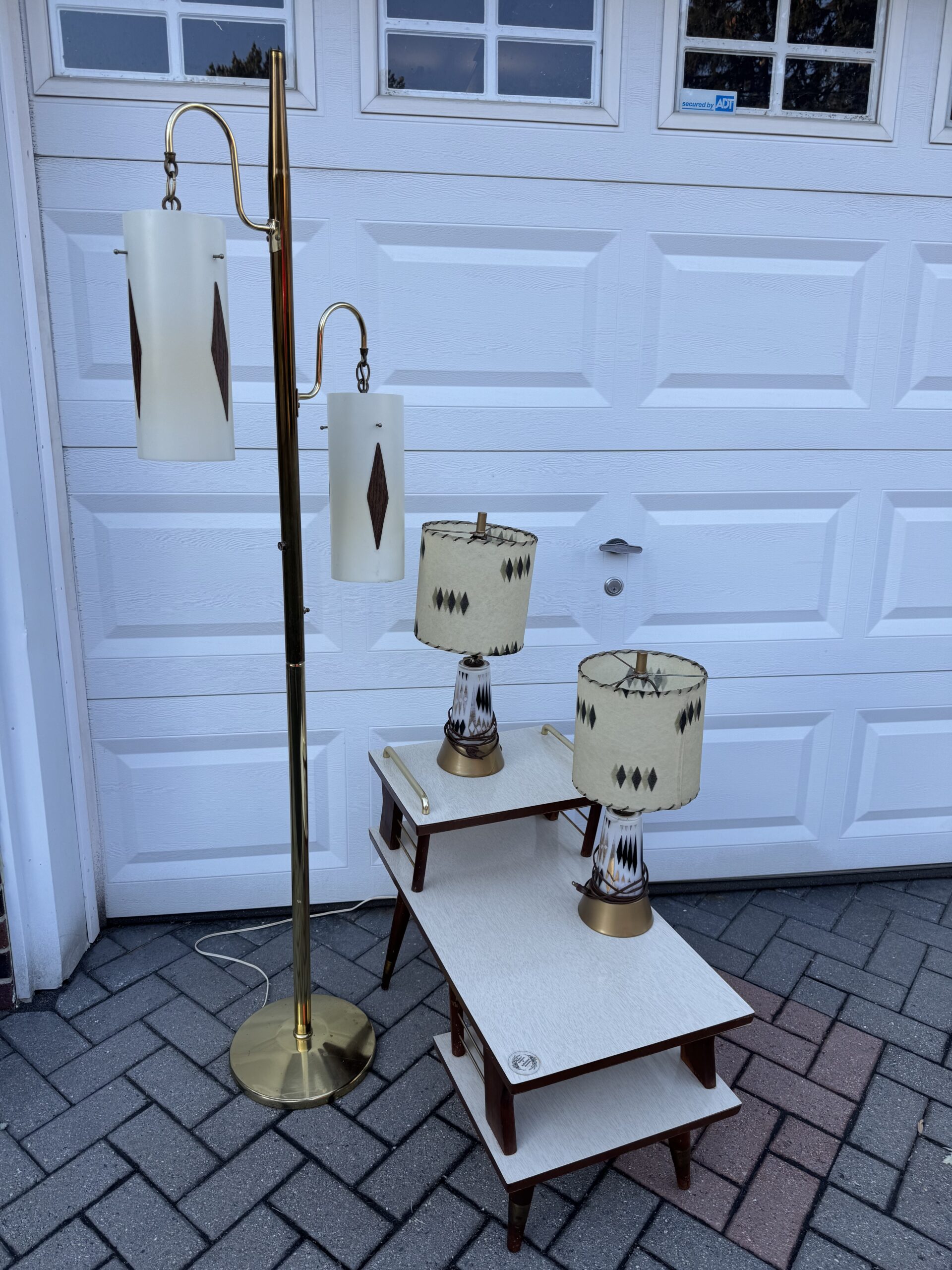 **This beautiful mid-century stand-up lamp features a three-way switch, providing versatile and warm lighting. It’s an original piece in excellent condition and comes as part of a matching set, including two lamps with three-way switches . This complete set is outstanding and rare to find all together in original condition!**