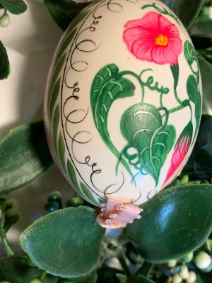 This was from an estate in Berks County. Beautiful handprinted hollow egg is painted on all sides and has a hanger attached made of ribbon. This is the size of a large duck egg.