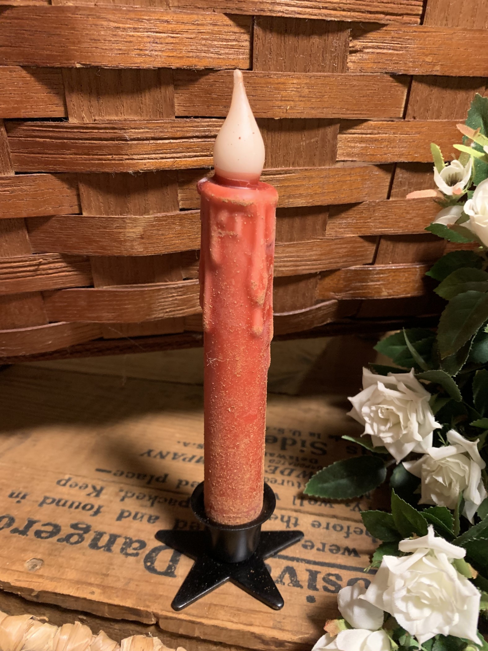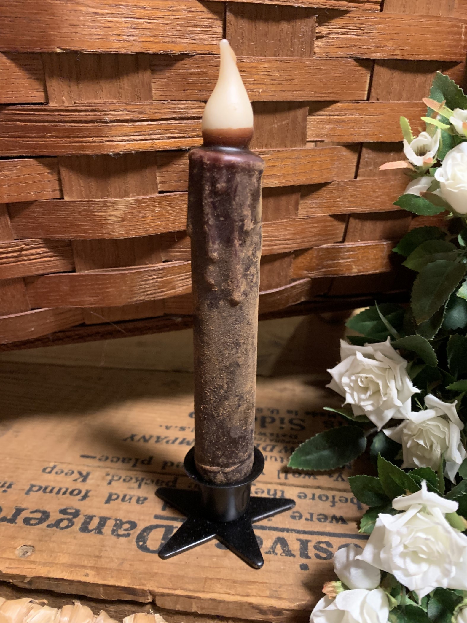 Decorative County 7″ Hand Dipped Taper Timer Candles with a black star candle holder.
