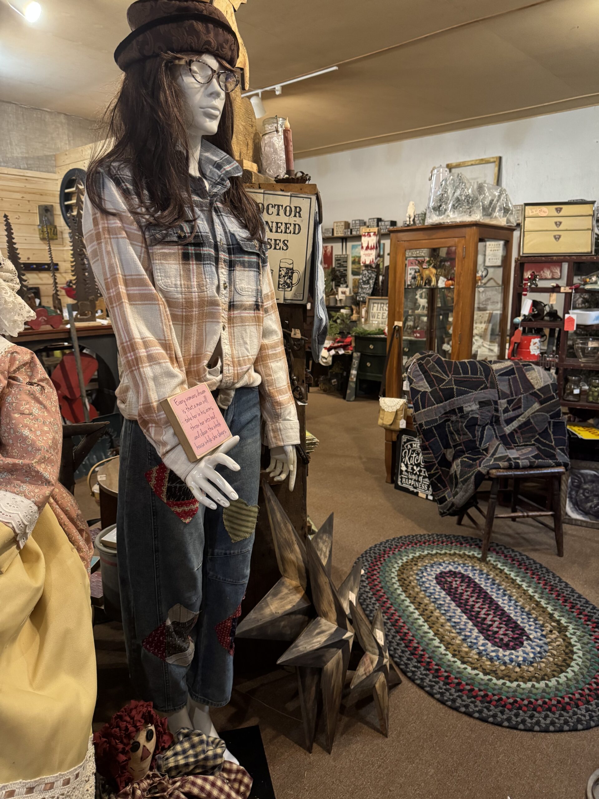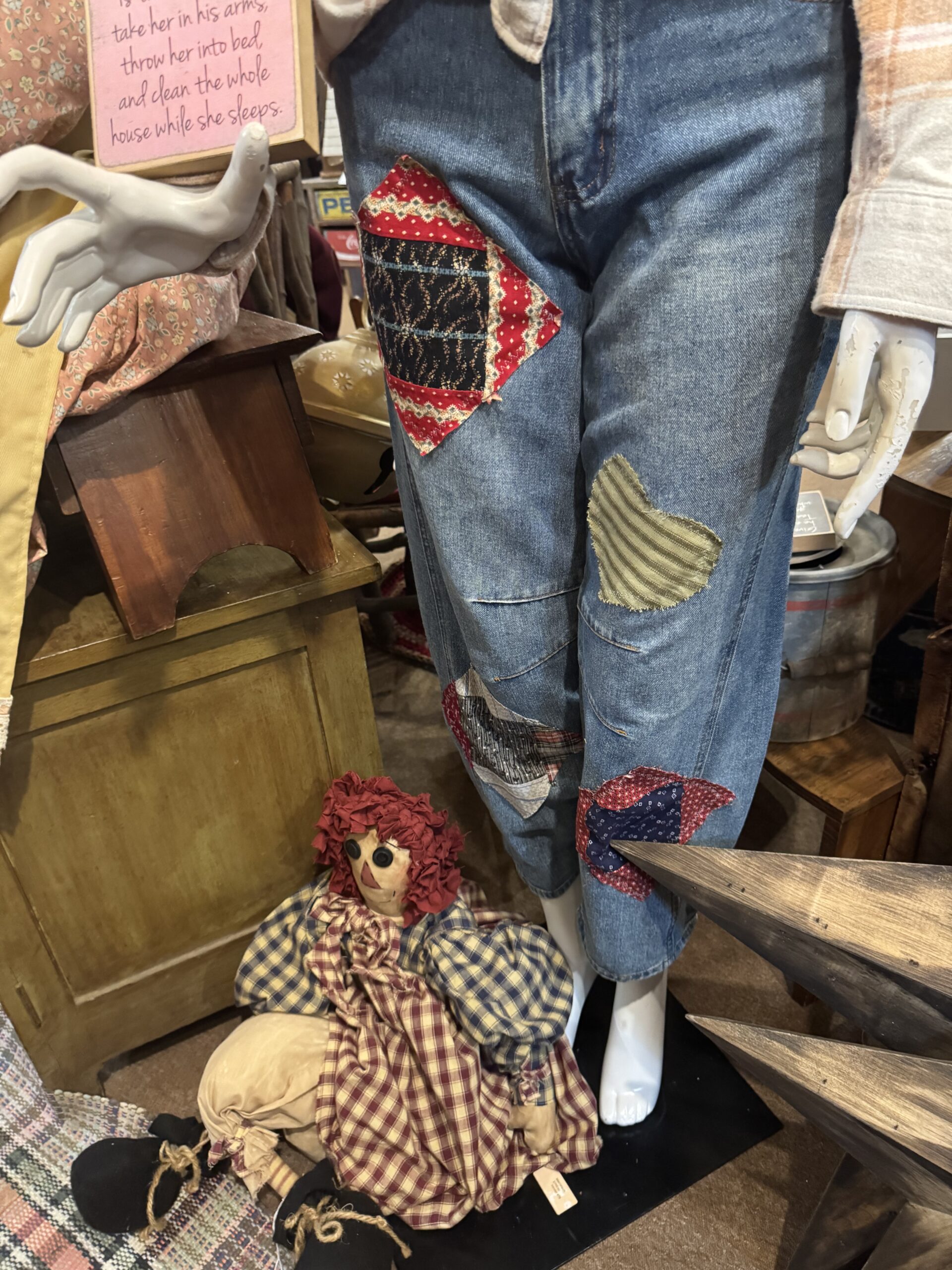 Roxy is on display wearing a size small pair of jeans embellished with vintage feed-sack patches, including a fun “Gold Cat” patch on the back. Her flannel shirt, a size medium, has been bleached to an awesome color and features a striking feed-sack quilt square on the back. These items are for sale and can be purchased through my website—Roxy is display-only at my booth.
