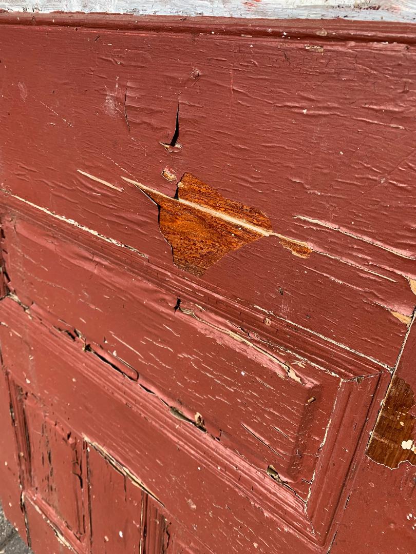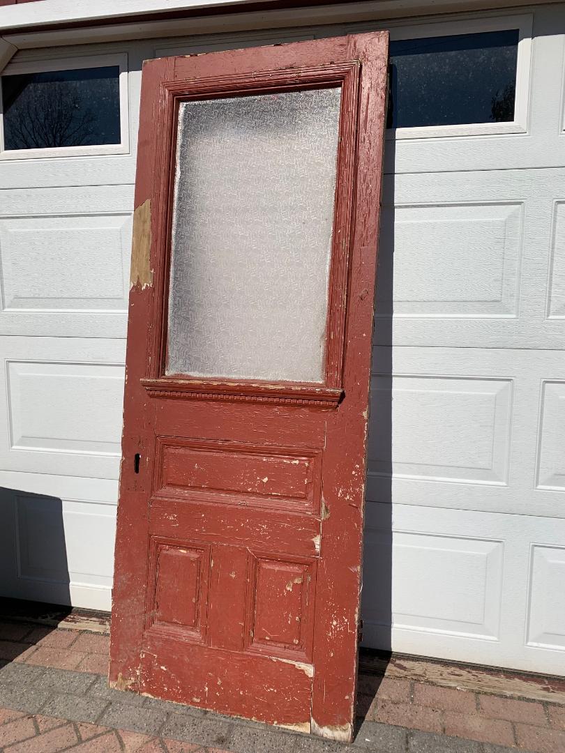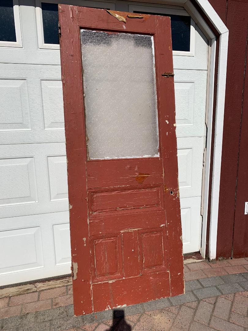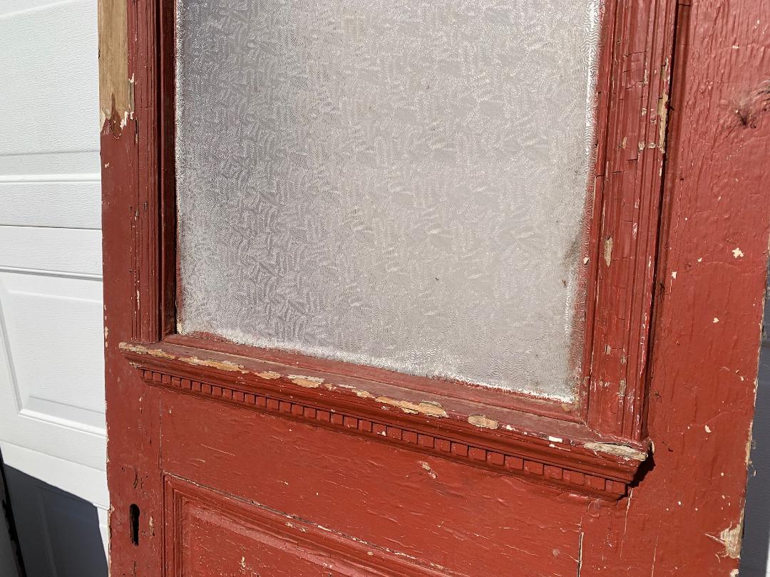 This is a Vintage Frosted glass red painted door that is chipping off. The measurements are
