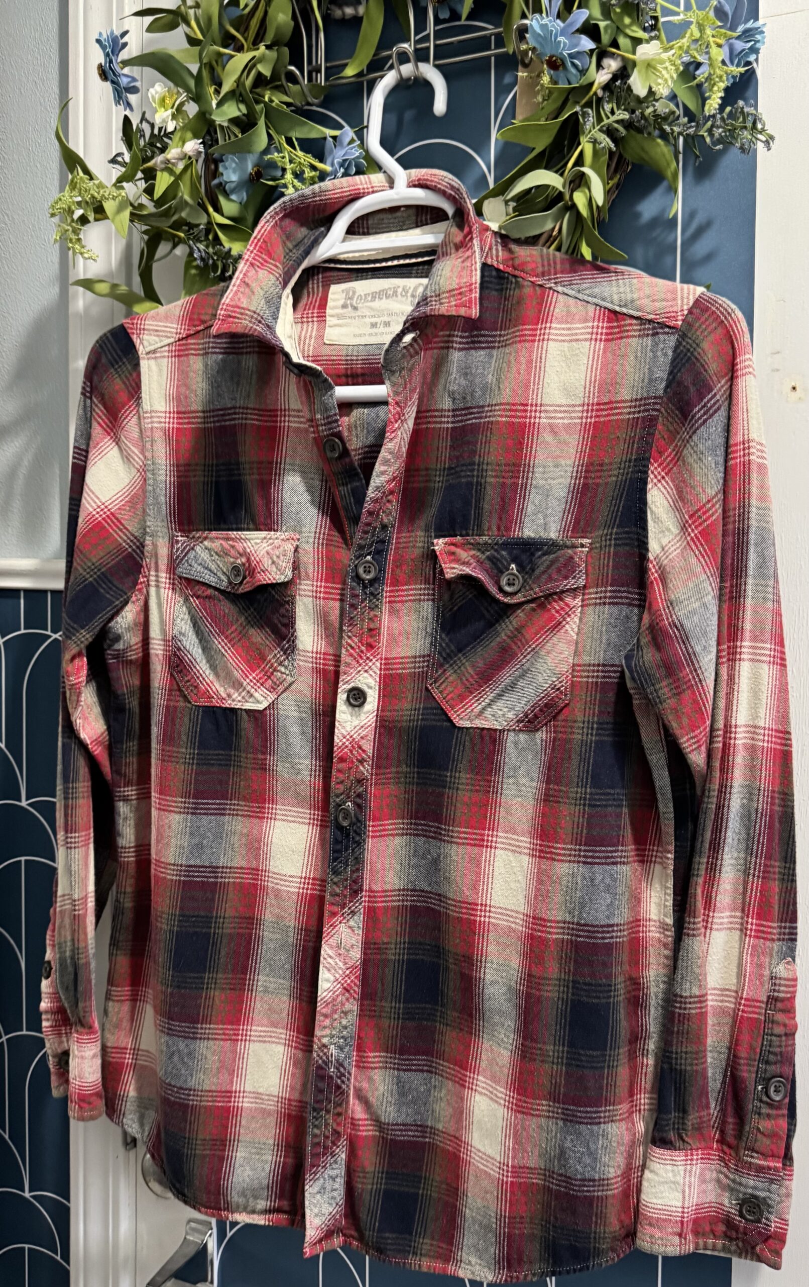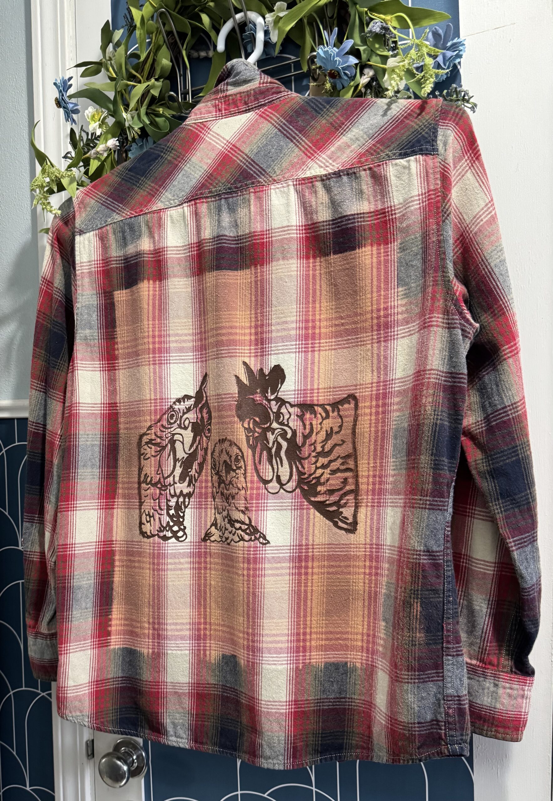 Flannel Shirt that has been bleached a square on the back with fabric paint and its chickens